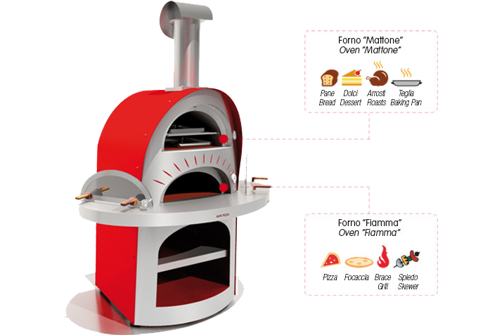 Nach dem Kauf sofort einsatzbereit ob im Garten oder auf dem Balkon, ist Duetto dank seiner 4 praktischen Räder leicht zu versetzen. Beim Beheizen des "Flammen"-Ofens (unterer Bereich) wird der "Stein"-Ofen (oberer Bereich) von den Flammen umhüllt, wobei eine konstante Temperatur bewahrt wird: auf diese Weise können gleichzeitig zahlreiche Gerichte auf zwei verschiedene Arten zubereitet werden. Dank der stundenlangen Hitzespeicherung können Backvorgänge in beiden Öfen beendet werden, ohne neues Holz nachlegen zu müssen.